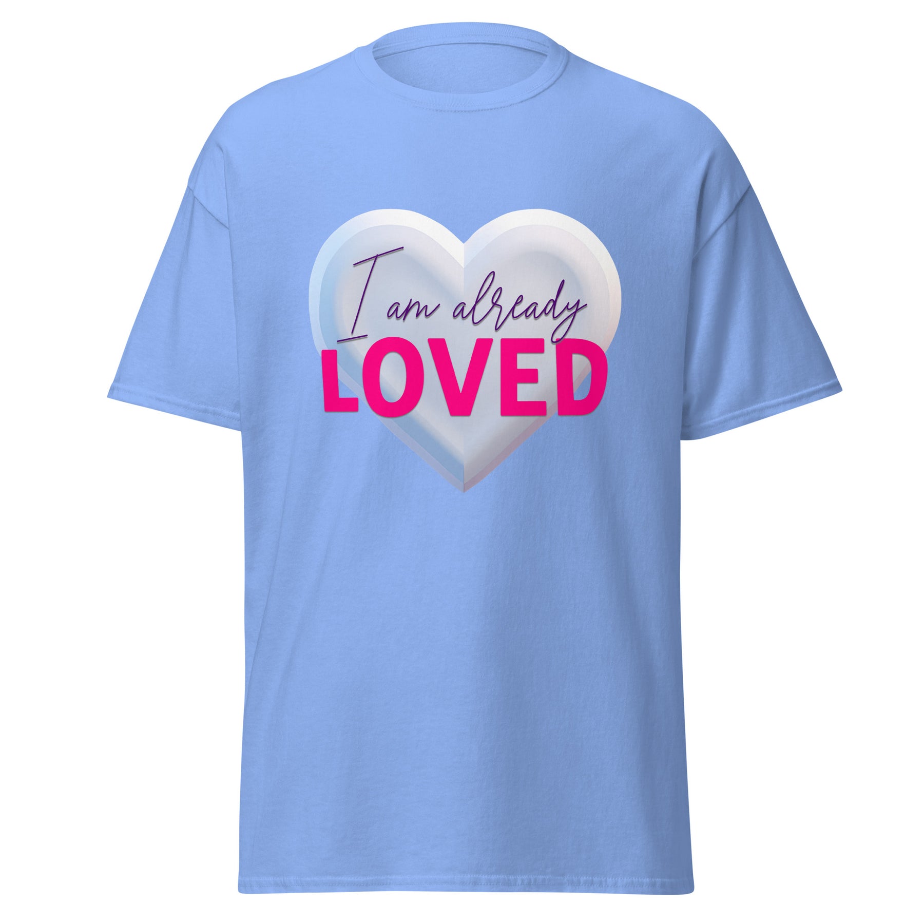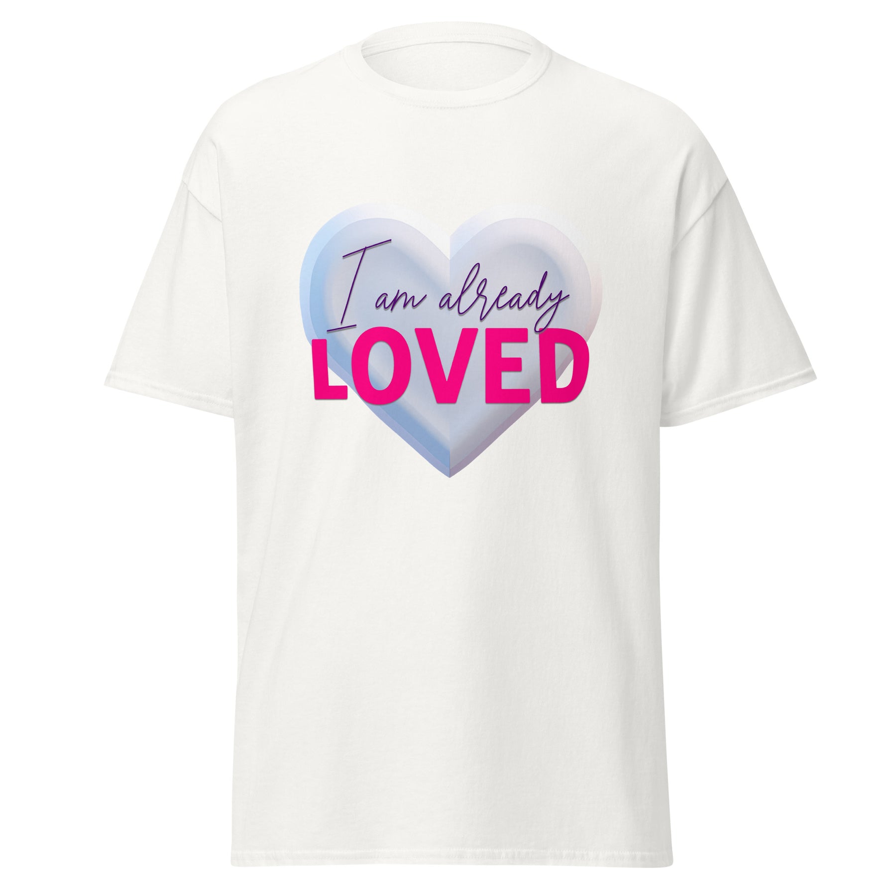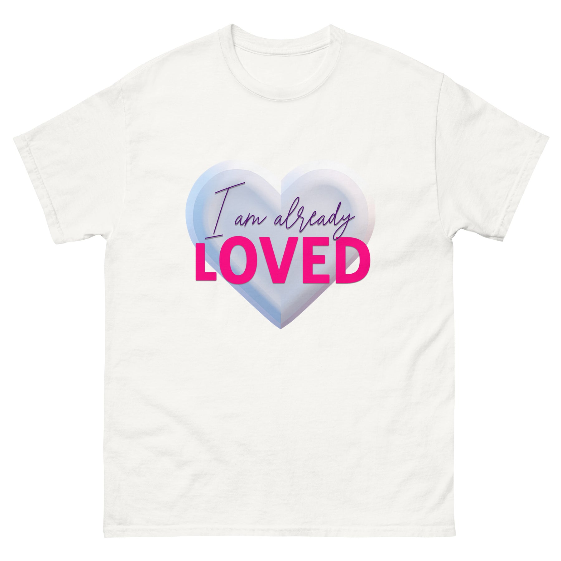 Design & Style Set against a deep, rich purple canvas, this design pops with dimension. It features a large, 3D-style silver/white heart that serves as a glowing background for the message. The phrase "I am already" is written in an elegant, deep purple script, while "LOVED" stands out in bold, hot pink lettering. The combination of purple, silver, and pink creates a fun, feminine, and eye-catching look.
